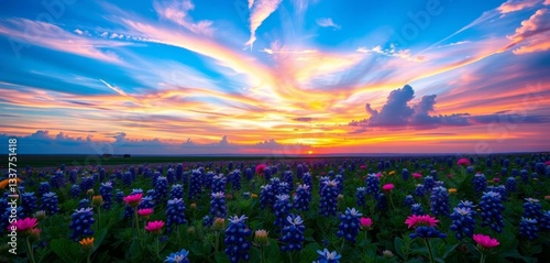 Sunset paints vibrant bluebonnet field, colorful cloudscape, distant horizon, botany, flora