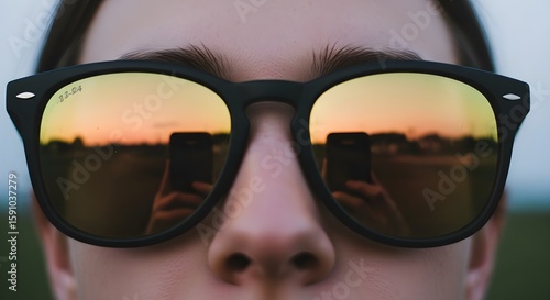 sunglasses, sunset, closeup, face, nose, eyewear, phone, hand, orange, yellow, sky, evening, twilight, warm, colours, summer, outdoors, nature, light, shadow, detail, texture, skin, person, human, image, photo, view, vibrant, beautiful, gold, hours, lens, goggles, fashion, accessory, style, optic, vision, sight, perspective, mirror, capture, moment, memory, feeling, emotion, mood