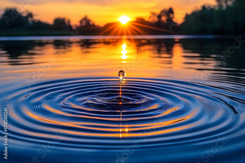 Sunset Reflections: Water Drop Creating Ripples on a Calm Lake Surface