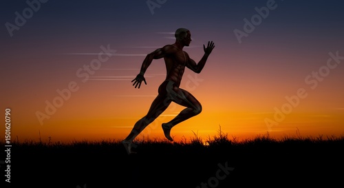 athlete, running, muscle, anatomy, human, silhouette, sunset, sky, field, grass, motion, speed, energy, power, strength, fitness, health, sport, exercise, training, body, man, sprint, competition, achievement, determination, landscape, horizon, evening, twilight, orange, red, yellow, dark, light, active, dynamic, fast, powerful