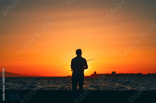 sunset, fishing, silhouette, fisherman, sea, sky, sun, beach, water, sunrise, sport, ocean, fish, lake, people, nature, golf, leisure, rod, children, boy, night, summer, dusk
