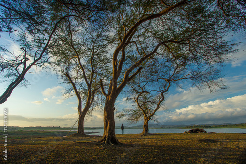 sunset view with a person standing in a big tree and there are s