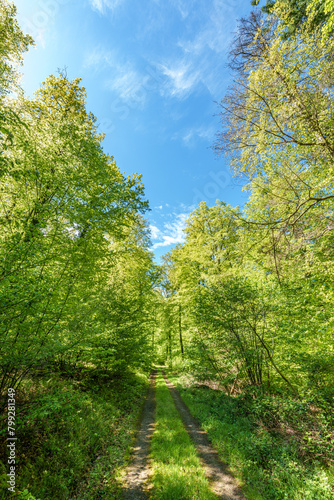 Sunshine filters through trees on woodland path, creating dappled shade - sustainability picture - stock photo - sunstar