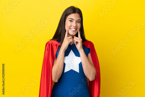 Super Hero Brazilian woman isolated on yellow background smiling with a happy and pleasant expression