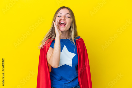 Super Hero Romanian woman isolated on yellow background shouting with mouth wide open