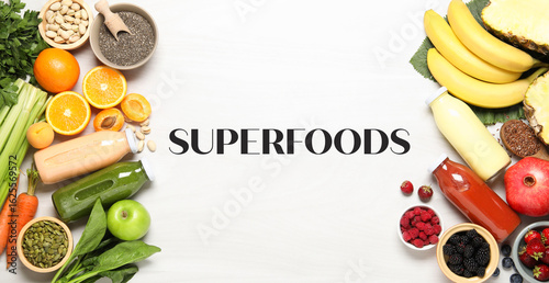 Superfoods. Healthy smoothies in glass bottles and ingredients on table, top view