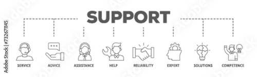 Support banner web icon illustration concept with icon of service, advice, assistance, help, reliability, expert, solutions and competence icon live stroke and easy to edit