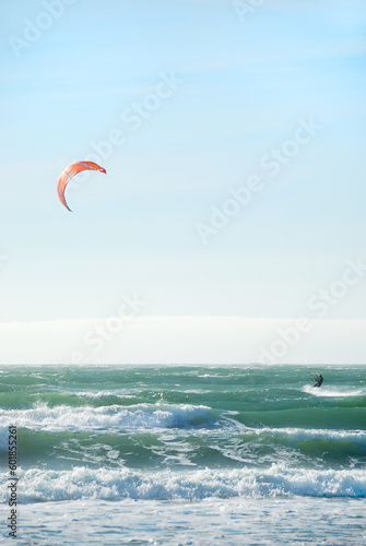 Surfer with red kite surfing off the beach in San Francisco, California on a sunny day.