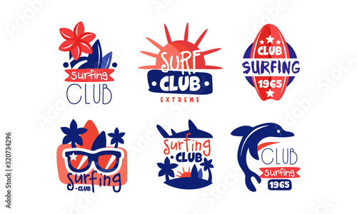 Surfing Club Retro Logo Design Collection, Extreme Sport Bright Badges, Emblems Vector Illustration