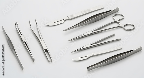 Surgical tools like scalpel, scissors, and forceps neatly arranged on white background