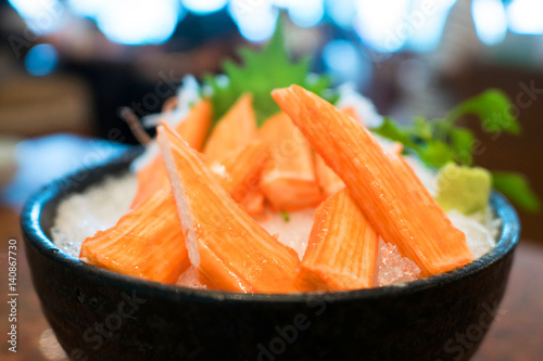 "Surimi" is japanese crab stick sashimi on ice in a black bowl