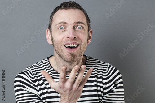 surprise and success concept - closeup of handsome middle age man looking surprised and thrilled with casual goatee and hand forward