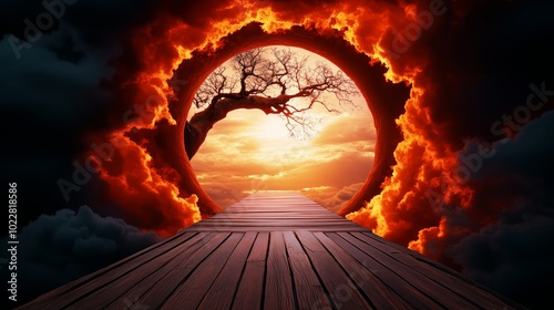 surreal, bridge, leading, nowhere, real, landscape, tree, sky, cloud, sunset, twilight, illusion, wood, pathway, nature, fantasy, dream, high-coloured, atmospheric, scenery, art, exploration, journey, surrealism, mystery, imaginative, wonder, light, shadow, horizon, calmness, whimsical, magical, depth, contrast, phantasmagoric, serene, aethereal, vision, beauty, perspective, enchanting, captivating, allure