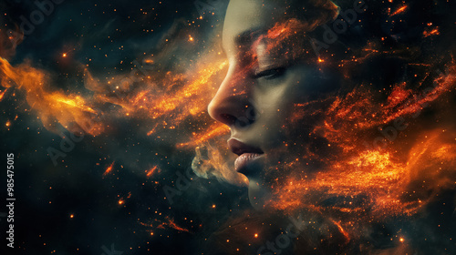 woman, face, flames, cosmic, surreal, abstract, dreamlike, aethereal, glow, space, universe, fire, star, mysterious, galaxy, artistic, beauty, mystical, fantasy, energy, emotion, feminine, celestial, spiritual, portrait, vibrant, expression, swirling, intense, high-coloured, atmospheric, mood, surrealism