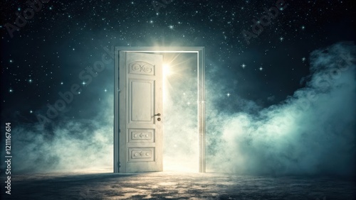 door, curiosity, surreal, mystical, aglow, exploration, imagination, wonder, intrigue, nirvana, unknown, dreamlike, atmosphere, fantasy, adventure, discovery, glowing, mysterious, night, fog, aethereal, shadow, whimsical, creative, vision, perception, open, escape, possibility, emotional, enchanting, surrealism, captivating, doorway, escapism, inspiration, journey, transcendence, inviting, allure, magical