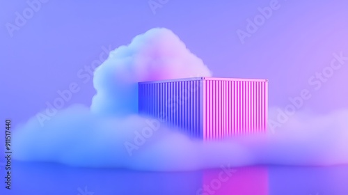 Surreal image of a shipping container enveloped in fluffy clouds, illuminated by vibrant pink and blue lighting.