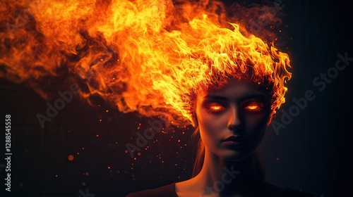 surreal, portrait, woman, flames, fire, intense, gaze, surrealism, creative, abstract, fantasy, artistic, imaginative, concept, mystical, burning, energy, aethereal, emotion, expression, vibrant, bold, mysterious, fiery, inferno, enigmatic, dramatic, heat, passion, powerful, striking, visionary, dreamlike, symbolism, art, transformation, supernatural, illusion, unique, contemporary
