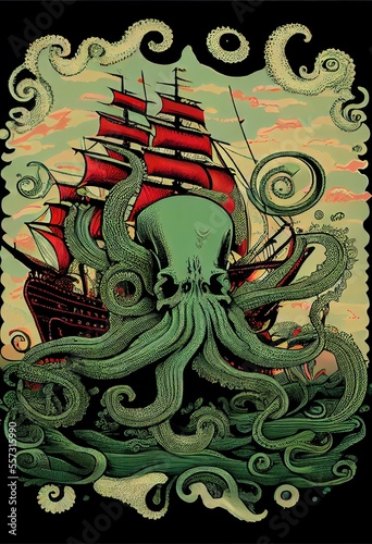 ship, surreal, sail, hallucinogen, art, pattern, vector, illustration, flower, decoration, design, ornament, floral, colours, drawing, painting, octopus, giant