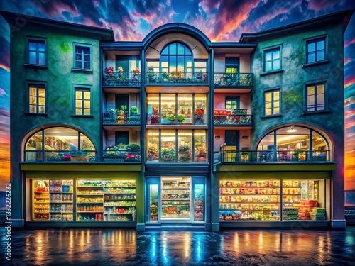 supermarket, retail, building, exterior, facades, surreal, night, dreamlike, architecture, store, commercial, mall, shop, boutique, structure, glowing, vibrant, colours, perspective, unusual, strange, mysterious, fantasy, magical, abstract, art, painting, design, illustration, photo, image, picture, visual, graphic, modern, contemporary, futuristic, neon, light, shadow, texture, surface, detail, element, composition, style, atmosphere