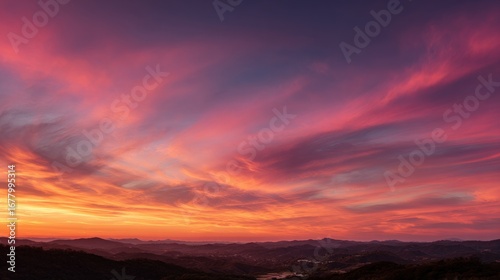 sunset, sky, landscape, dramatic, vibrant, magenta, pink, purple, orange, cloud, horizon, dreamlike, surreal, romantic, awe, saturated, colours, fiery, gold, light, cirrus, wispy, beautiful, painterly, aethereal, nature, wonder, scenic, breathtaking, atmosphere, twilight, evening, gradient, high-coloured, contrasting, cloudscape, celestial, fantasy, glow, illumination, colours