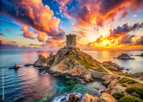 Surreal View of Aragonese Tower in Isola Rossa, Sardinia on a Rocky Promontory Overlooking the Mediterranean Sea at Sunset with Dreamlike Elements and Vivid Colors