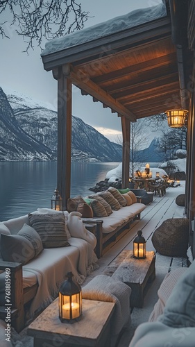 a, luxurious, recreation, area, eco, hotel, norwegian, fiord, surrounded, serene, winter, landscape, calm, delicate, dusk, fireplace, flames, furniture, glow, gold, lounge, reflective, rise, vibrant, warm, cushion, foreground, arrangement, deck, dusting, feature, hue, set, thick, concept, lake, orange, plush, snow, mountain, natural, snow-covered, stone, wooden