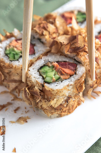 Sushi roll with chopsticks on a white plate close up.