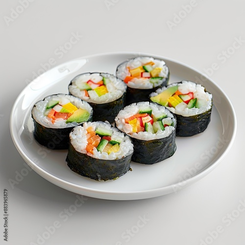 Sushi with accompaniments in a white plate, looks delicious on a clean white background, typical korean food