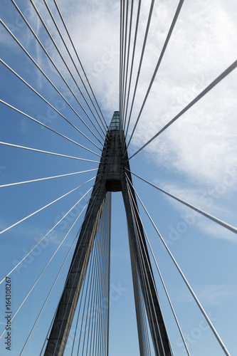 architecture, asphalt, blue, bridge, built structure, connection, day, engineering, modern, no people, outdoors, sky, suspension bridge, transportation
