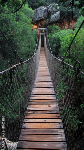 suspension bridge, nature, ravine, cliff, peaceful, exploration, hiking, paseo, scenic, travel, landscape, forest, calmness, connection, view, park, wilderness, environment, natural beauty, remote, tour tourism, path, adventure, trekking, journey, high altitude, foliage, flora, setting, canopy, slope, ecotourism, outdoors