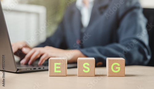 sustainability, climate change, economical, renewable energy, green energy, eco, communicate, community, renewable, resource. A woman is typing on a laptop with the letters ESG on a wooden block.