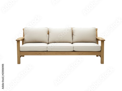 Sustainable and Wooden product. Stylish wooden sofa with soft cushions, perfect for modern living spaces.
