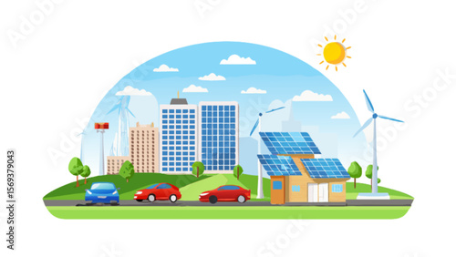 Sustainable city landscape with solar panels, wind turbines, electric cars and green energy solutions design