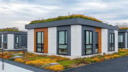 Sustainable community through innovation for well-being Modern eco-homes with green roofs and surrounding landscaping.