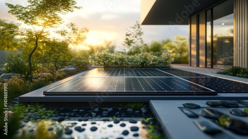 solar, panel, energy, sustainable, renewable, clean, technology, modern, home, architecture, design, house, building, rooftop, eco, environment, green, nature, garden, landscaping, residential, sun, sunset, sky, tree, plant, stone, rock, water, feature, exterior, contemporary, elegant, aesthetic, peaceful, serene, calm, bright, efficient