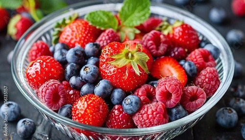 Свежие спелые ягоды (клубника, черника, малина) в прозрачной тарелке.