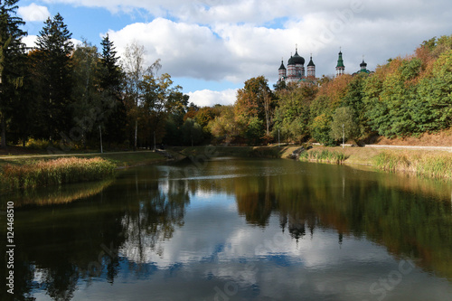 big, tree, water, lake, fall, red, colours, green, kiev, cupola, monastery, park, bench, style, grass, ukraine, light, temple, church, black