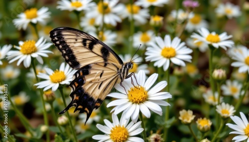 Swallowtail Butterfly Pollinating White Daisies in a Vibrant Spring Garden
