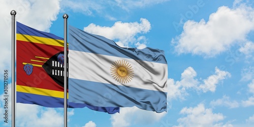 Swaziland and Argentina flag waving in the wind against white cloudy blue sky together. Diplomacy concept, international relations.
