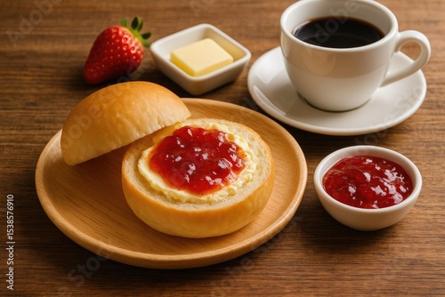 food, hot drink, wood, table, japan, strawberry, bread, menu, breakfast, asian, desk, japanese, bakery, shop, epicure, dish, wooden, baked, confectionery, jam, sweet, morning, margarine, asia, asian cuisine, close, closeup, delicious, eat, take out
