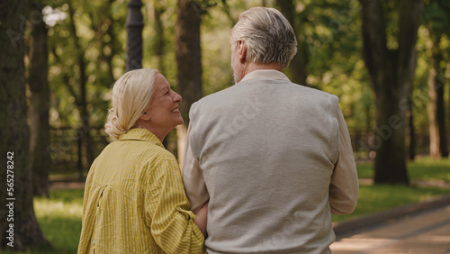 Sweet elderly couple walking in park together, enjoying conversation on a date in park