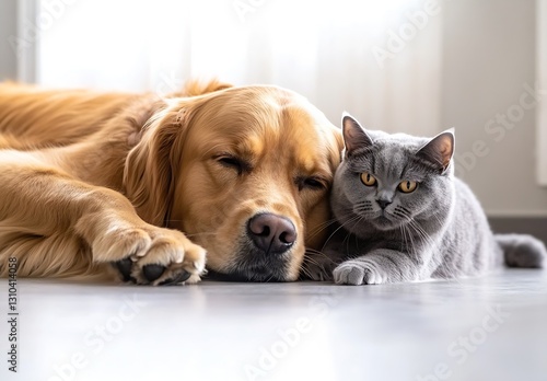 Sweet golden retriever dog and playful gray cat snuggling peacefully together indoors : Generative AI