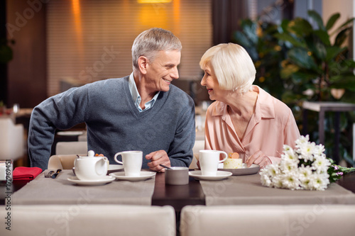 Sweet life. Good looking positive mature couple posing in profile while smiling and having desert