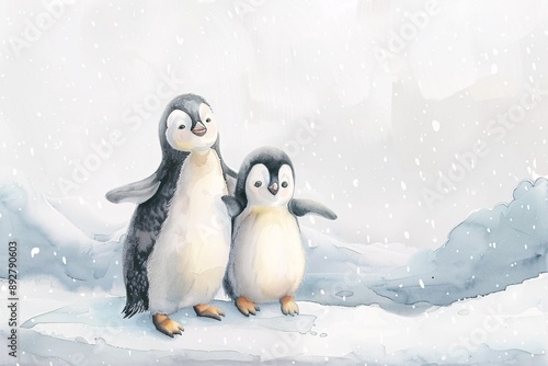 penguin, family, cute, adorable, animal, wildlife, watercolor, soft, tone, icy, winter, landscape, arctic, snowy, illustration, painting, art, gentle, sweet, friendly, whimsical, happy, cold, antarctic, cartoon, character, isolated