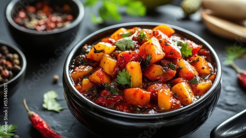 Sweet potato curry in a bowl on a black slate, stone or concrete background.
