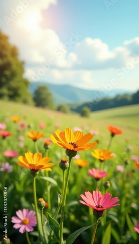 Sweet wildflowers in sun-drenched meadow, blurred horizon , landscape, light, colorful