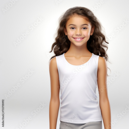 Sweet young girl dressed in comfortable vest undergarments, exuding confidence as she poses gracefully on a pristine white surface. Generative AI.