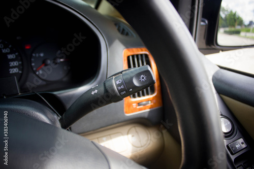 Switch off lights in a car. close-up Car integrated turning indicator with headlight switch toggle.
