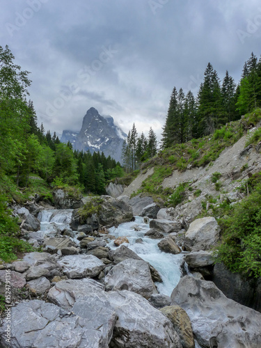 Switzerland, Meiringen, a rocky river with trees on the side of a mountain