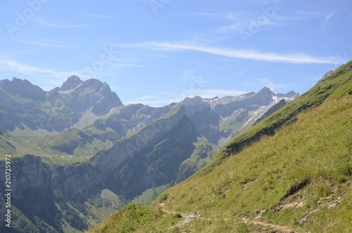 mountain, countryside, nature, heaven, green, summer, vale, cloud, travel, forest, view, alpen, blue, snow, panorama, hill, peak, tree, alpine, rock, high, grass, hiking, hike, wanderlust, hiker, bergsee